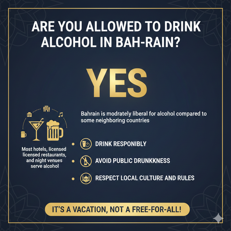 Yes — Bahrain is moderately liberal for alcohol compared to some neighboring countries. Most hotels, licensed restaurants, and night venues serve alcohol. Just remember:
