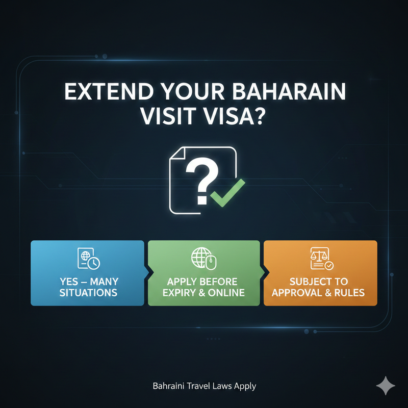 Yes — in many situations, you can extend your stay beyond your initial planned period. This requires applying before your current permission expires and can usually be done online — but be aware that extensions are subject to approval and specific rules under Bahraini travel laws.